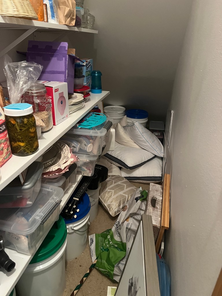 So I started with that. I would beg you to not judge but I know you will. It’s OK, I would. Here is the abandoned mess that we had. See? See the, ah, bag for dog food? The disarray? The chaos? And that’s how every well-intentioned project begins, isn’t it? With more work before you can even get to the project. Because, you know, you have to clean your way into it.